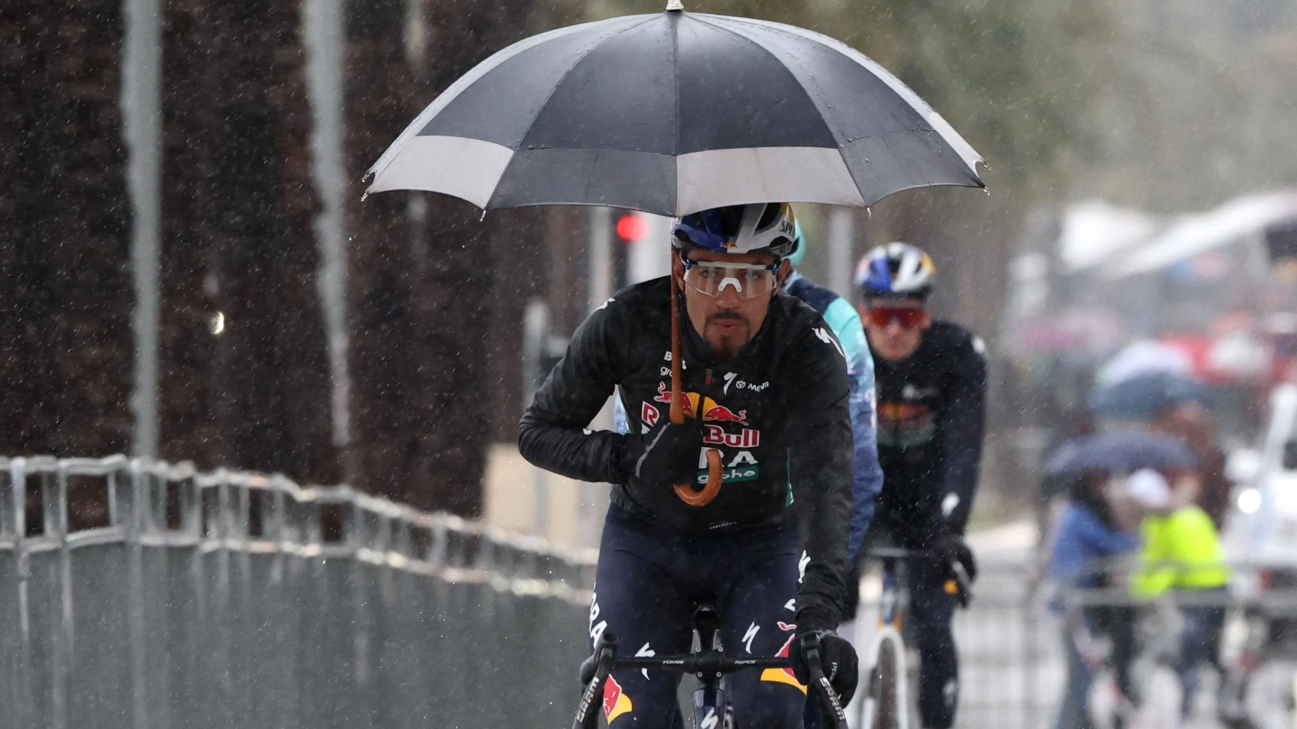 Buskonvoi statt Radfernfahrt: Wegen heftigen Regens und Schneefalls im Hinterland der Cote d’Azur wird die vorletzte Etappe von Paris–Nizza extrem verkürzt.